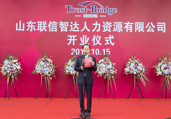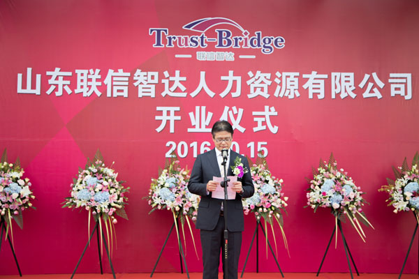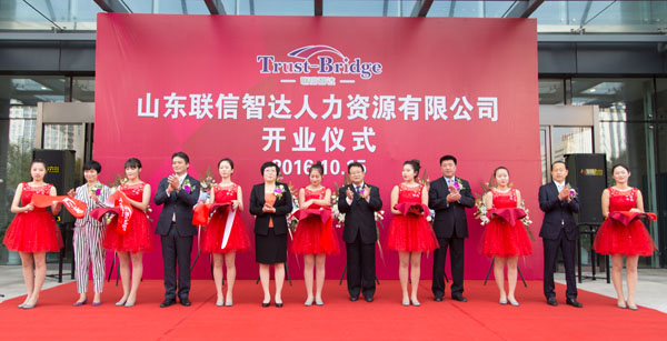 2016年10月15日上午8:30,由威海聯橋集團與日本株式會社Trust-Tech共同出資成立的山東省首家中外合資人力資源公司—山東聯信智達人力資源有限公司開業(yè)儀式隆重舉行。人社部勞動爭議研究室主任李天國、威海市人社局局長王子明、威海市商務局副局長劉秀景,高區(qū)黨工委副書記、管委常務副主任喬軍,聯橋集團董事長慕镕鍵、日本株式會社Trust-Tech社長西田穰等領導以及聯橋集團員工、事業(yè)合作伙伴、媒體記者等共計200余人參加了開業(yè)儀式。山東聯信智達人力資源有限公司總經理梁瀟尹主持開業(yè)儀式。