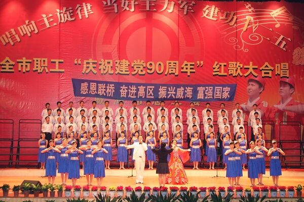 本次紅歌大合唱由市總工會主辦,以“唱響主旋律,當好主力軍,建功十二五”為主題,共有13支代表隊參加了演出,聯(lián)橋集團作為威海高技術產業(yè)開發(fā)區(qū)選送的唯一代表隊參加了本次演出。聯(lián)橋集團是第三個出場的代表隊,開場一亮相,合唱隊伍的青春靚麗和朝氣蓬勃的精神狀態(tài)就贏得了熱烈的掌聲。全體職工意氣風發(fā),豪情滿懷,用歌聲完美演繹了廣大職工對家的眷戀以及對黨和國家的真摯情懷。慕鎔鍵董事長受邀陪同市領導一同觀看了演出。